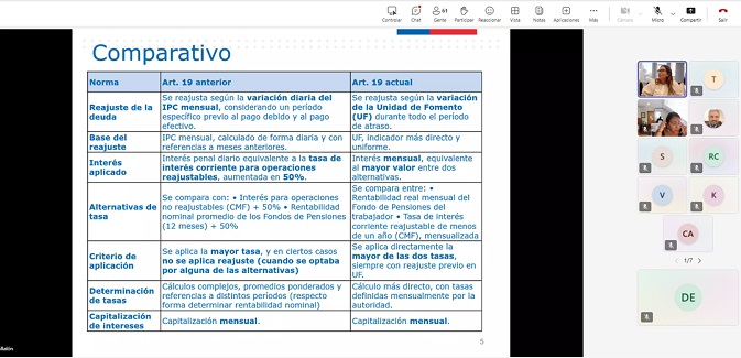 Ambas actividades tuvieron como objetivo fortalecer el conocimiento técnico y normativo de los/as participantes respecto de los nuevos criterios aplicables al cálculo de cotizaciones previsionales adeudadas, considerando los reajustes e intereses que deben incorporarse en los procedimientos concursales de Reorganización y Liquidación. En particular, se abordó el impacto que esta metodología tiene en la determinación del monto de los créditos previsionales que las AFP y la AFC verifican en los concursos.