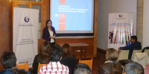 Iquique. 27 de mayo de 2015. La coordinadora SIR de la primera región, Paulina Ávila Vergara, efectuó una charla sobre la Ley de Insolvencia y Reemprendimiento N° 20.720 a 30 iquiqueños que participan en el programa de apoyo al entorno emprendedor de Corfo “Emprende 3.0”.